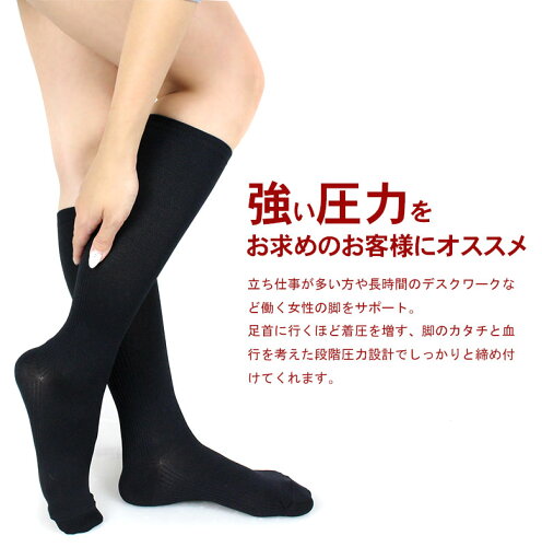商品名 強圧 38cm丈 着圧ハイソックス サイズ 22-25cm カラー 黒 素材 ナイロン(セコテック)、ポリウレタン、ポリエステル モデル 身長162cm 商品説明 【強い圧力をお求めのお客様にオススメ】 立ち仕事が多い方や長時間のデスクワークなど働く女性の脚をサポート。